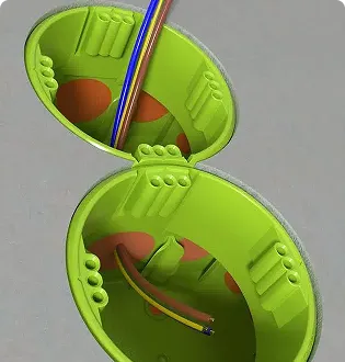 SCS technologie s membránou a systém Cable-Plopp umožňuje přímé, vzduchotěsné propojení. Krabice navíc díky většímu průměru a hloubce 49 mm poskytuje více prostoru pro svorkování než běžné instalační krabice.